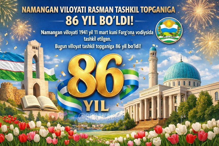 NAMANGAN VILOYATI RASMAN TASHKIL TOPGANIGA 86 YIL BO`LDI. Namangan viloyati 1941 yil 11 mart kuni Farg`ona vodiysida tashkil etilgan.