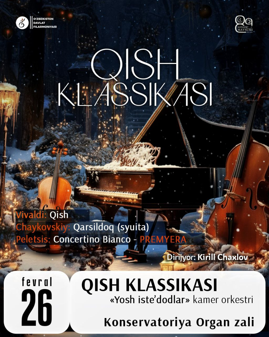 O'zbekiston davlat filarmoniyasining fevral oyidagi konsertlariga marhamat, aziz muxlislar! “QISH KLASSIKASI”. "Yosh iste'dodlar" kamer orkestri